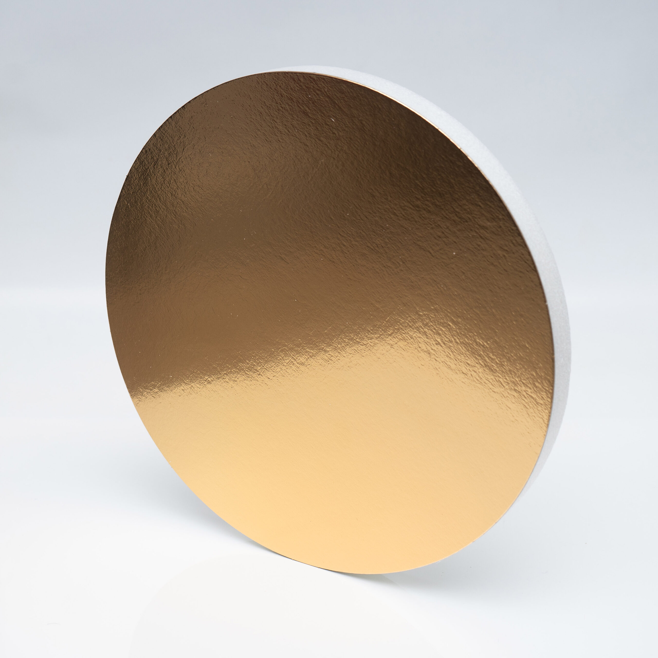 Ten okrągły podkład ze styroduru w kolorze białym z złotą podkładką do żywności jest doskonały do prezentacji eleganckich tortów i deserów. Jego neutralny, biały kolor pasuje do każdego stylu, a złota podkładka dodaje luksusu i blasku.